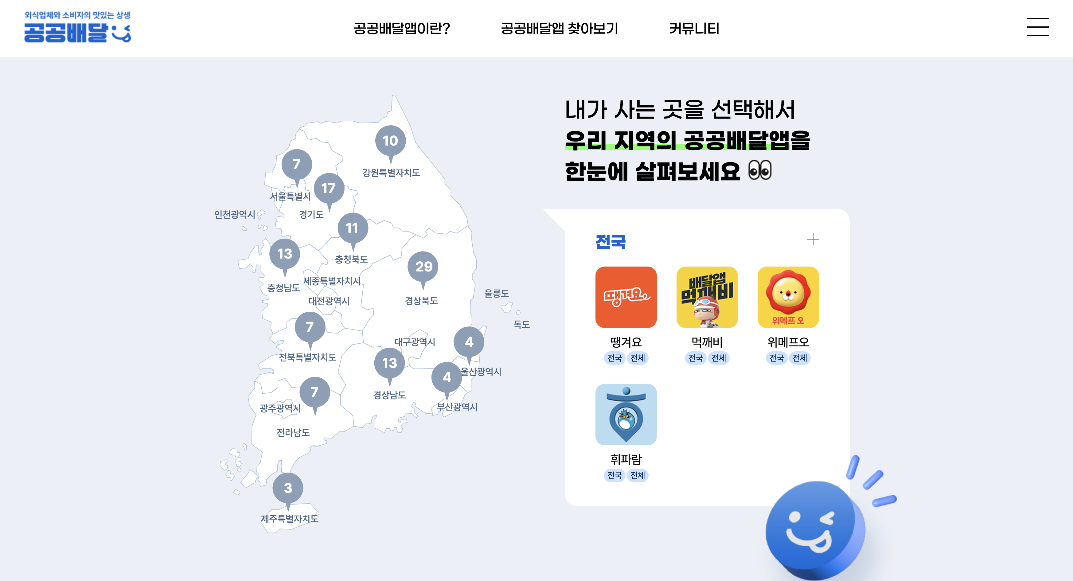 공공배달앱은 지역별로 운영되며, 공공배달 통합포털 "더외식"에서 확인할 수 있습니다. 지자체 개발 앱(배달특급, 대구로 등 8개)과 민관협력형 앱(땡겨요, 먹깨비 등 4개) 중 원하는 앱을 선택해 다운로드하세요.